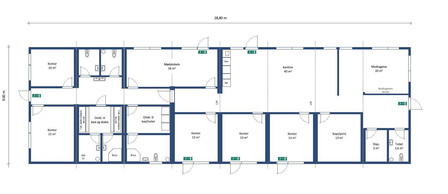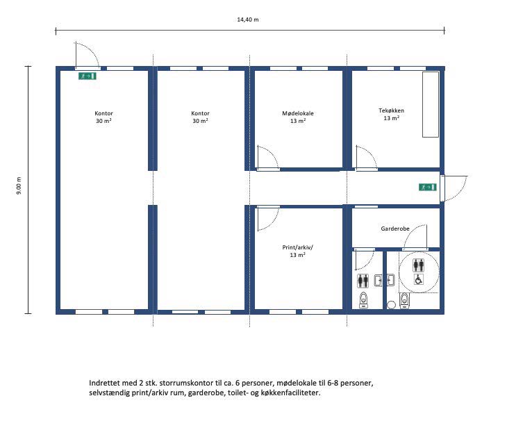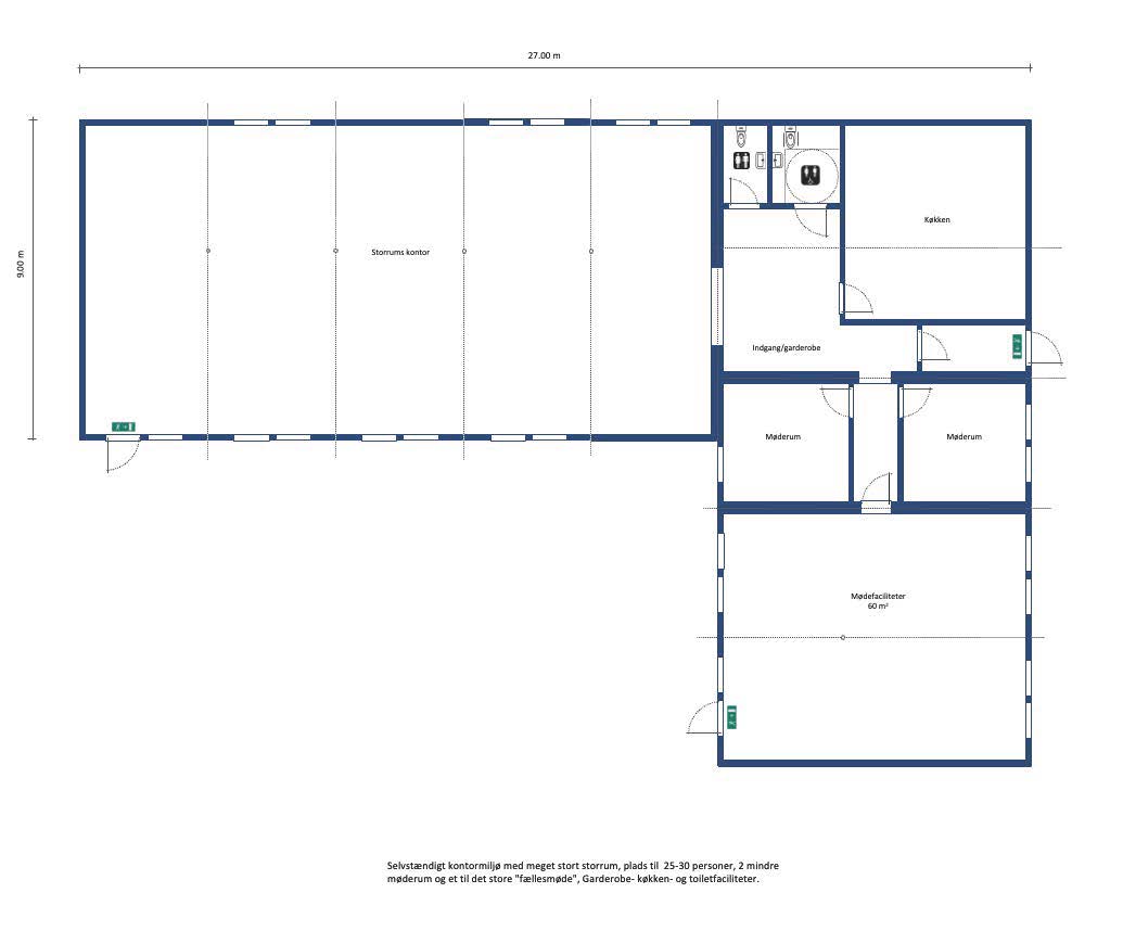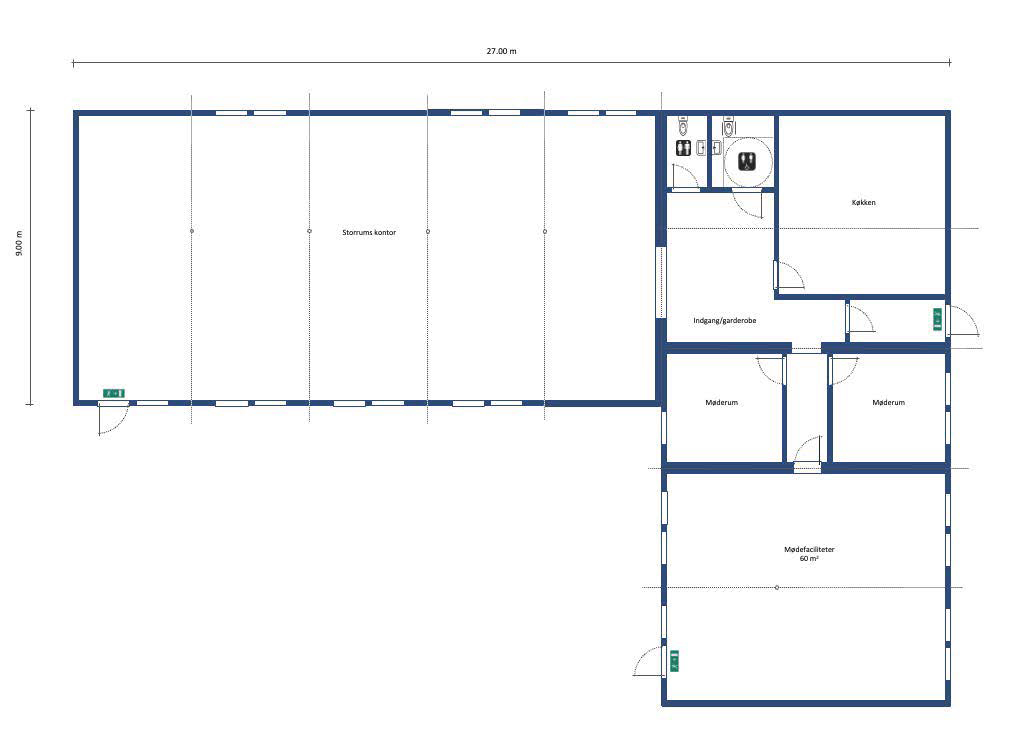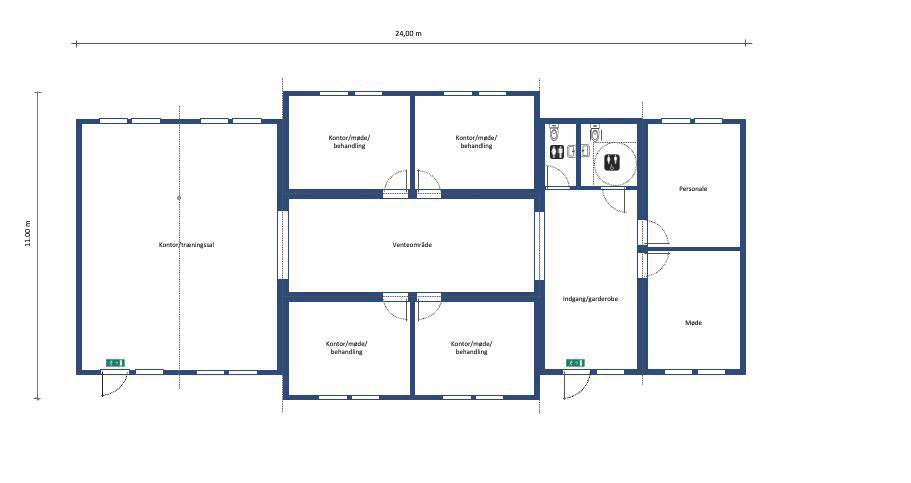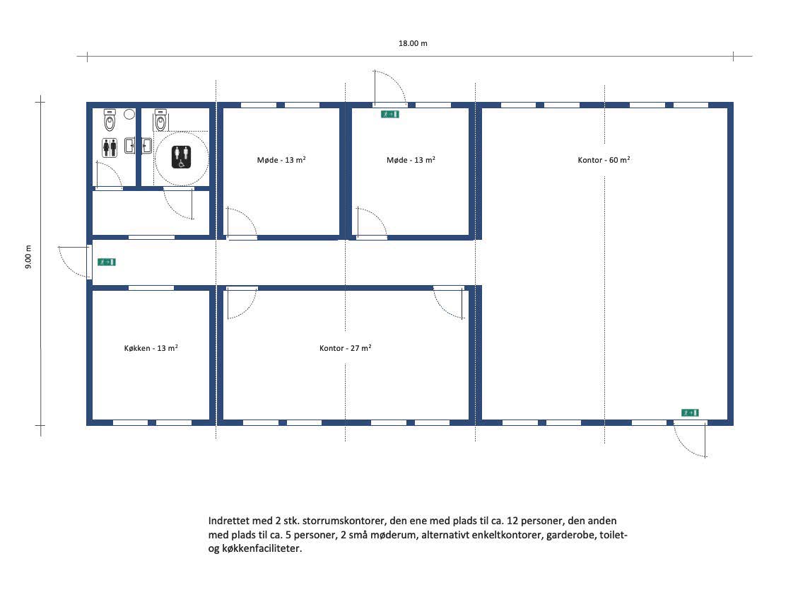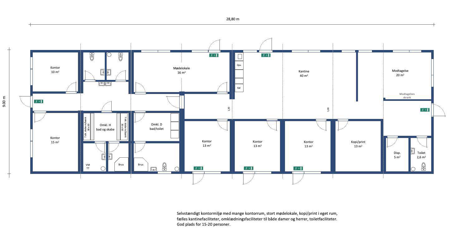 Indrettet som “Sundhedsklinik / Health Care” med træningssal, flere behandlingsrum for massage, fysioterapi, kiropraktor etc., venteområde, personalerum, garderobe- og toiletfaciliteter, alternativt som kontormiljø med storrumskontor, flere mindre rum for 2-3 personer, mødelokaler og fællesareal. Garderobe, toilet- og køkkenfaciliteter.
